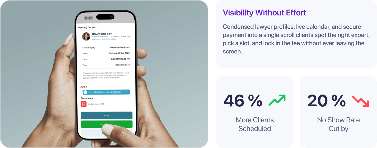 The legal industry was rife with inefficiencies. Clients faced a confusing and often frustrating process when seeking legal advice. Lawyers struggled with managing inquiries and bookings, leading to missed opportunities and client dissatisfaction.