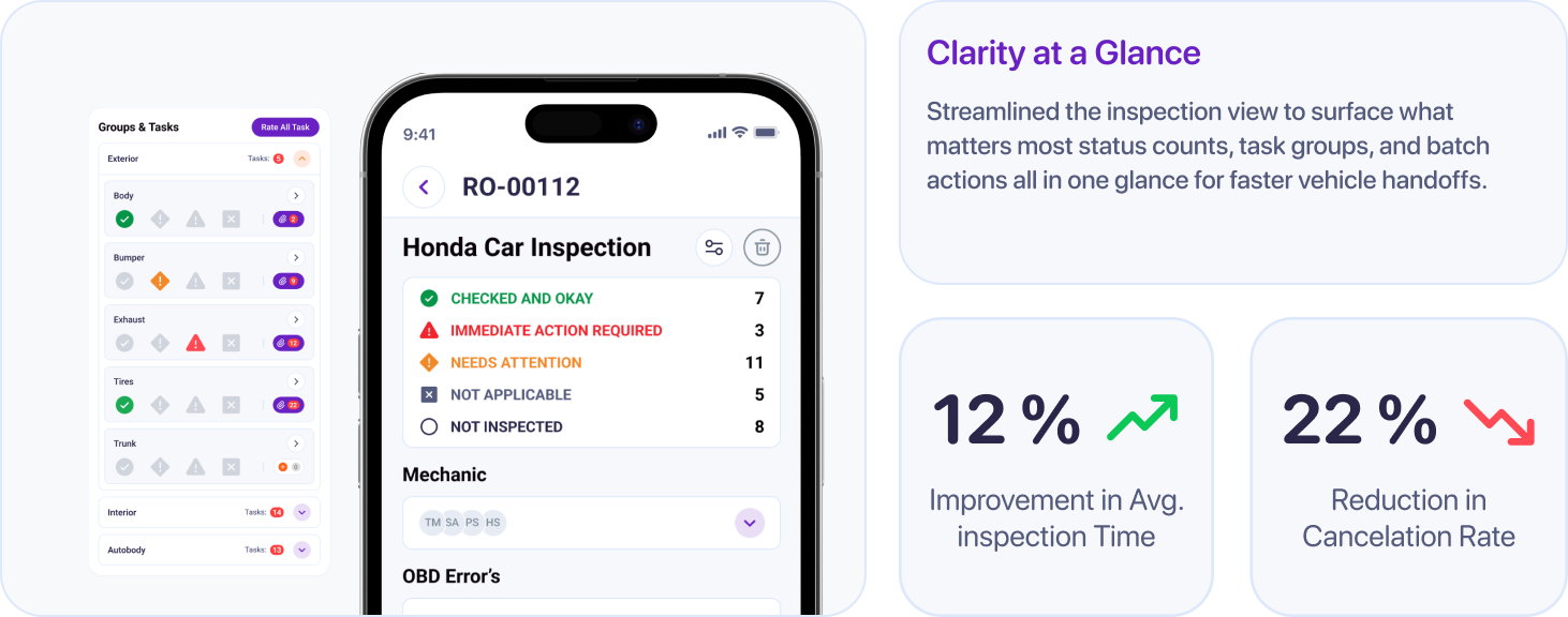 Turned paper vehicle checks into a 4-minute mobile workflow, cutting inspection time by 78% and establishing a mobile-first foundation for 67+ shops.